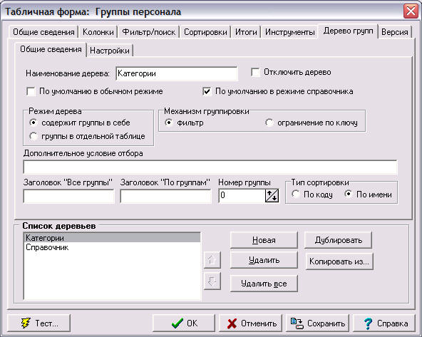 Вся работа по настройке иерархических списков выполняется на закладке «Дерево групп» формы редактирования описания табличной формы.