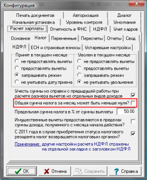 Для реализации этого варианта следует использовать настройку «Общая сумма налога за месяц может быть меньше нуля?» в Конфигурации на закладке Расчет зарплаты / Налог / НДФЛ: