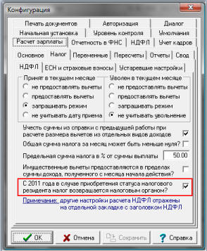 Для реализации этого варианта предусмотрена дополнительная настройка «С 2011 года в случае получения статуса налогового резидента налог возвращается налоговым органом» на закладке Расчет зарплаты / Налог / НДФЛ Конфигурации: